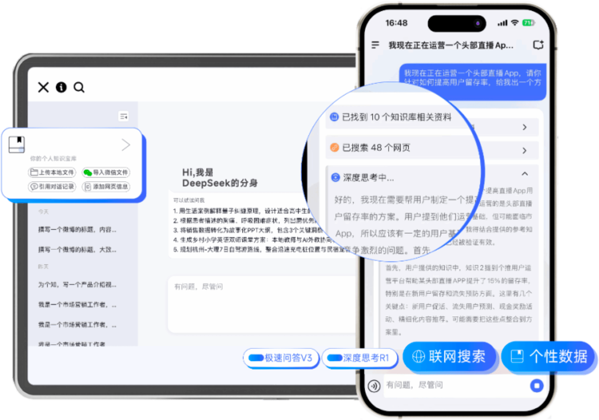 打造“深度思考”、“联网搜索”和“个性数据”三大模式,让个人用户不仅可以畅快体验百问不厌,还可以轻松玩转知识管理,在日常问答中就能实现知识积累,打造一个专属于你、越用越聪明的第二大脑。围绕个人用户日常办公与学习需求,构建全流程的智能助手服务体系,支持文档写作、笔记整理、日程管理、会议纪要生成、邮件撰写、知识检索等任务,帮助用户释放认知负担、提升执行效率,是你身边真正“懂业务、会写作、能规划”的AI搭档。