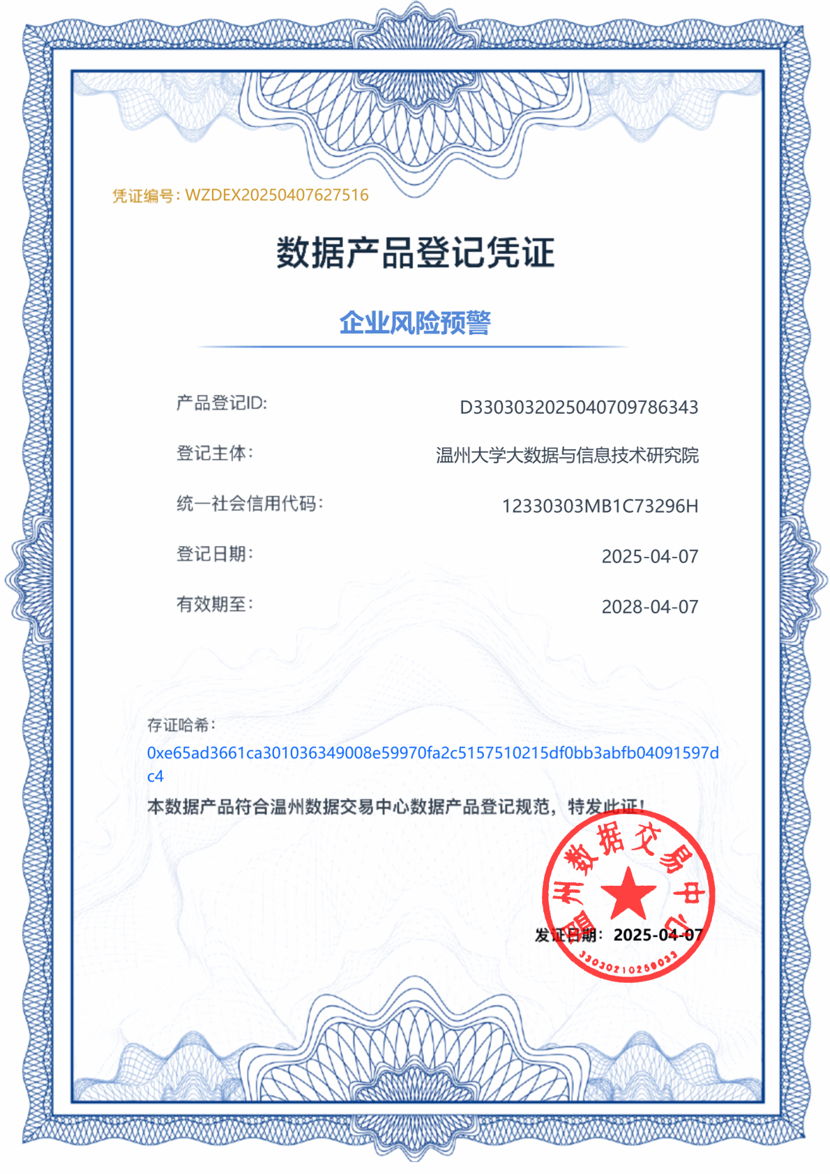 产品已通过温州数据交易中心登记,定位于面向企业的智能化风险管理与健康诊断服务。依托多维度企业数据构建智能监测体系,持续跟踪经营动态,帮助客户实现经营风险的提前识别与动态管控;同时生成企业动态风险评价与风险画像,并在发现潜在问题时自动推送预警信息,从而协助企业管理者提升决策效率,有效防范和化解经营风险。